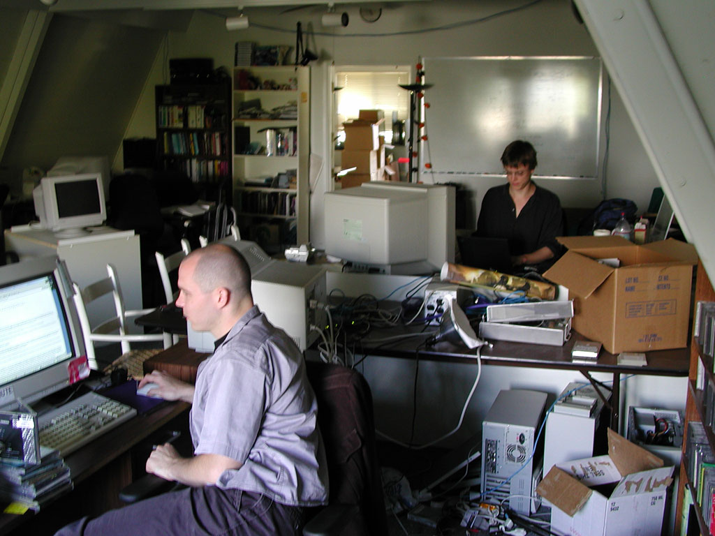 Working in Oakland's Embarcadero Cove, renting office space for the summer from Chris Hecker. Embarcadero Cove is a cluster of old Victorian-era buildings relocated from construction sites to a quiet cluster near a small boat harbor. A loose collection of independent game programmers work out of the second floor of a barn-like building. Here's some photos inside today: