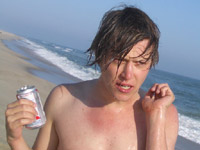 And when I finally couldn't stand up enough to make it fun, when I was going facedown on too many waves and sailing on too few, when my friends were putting on their clothes and folding up towels, I walked up back to the beach. I picked up the last cold Pabst and cracked it into my thirsty maw, sitting on the beach elbows on knees where the surf could still touch my ankles. I sucked down the glorious cold fluid. My knees were shaking, my arms trembling. I poured the beer over my head, to cool and invigorate me. It stung the small cuts on my head and shoulders. Ethan came up behind me, to take my picture - I was stunned, surprised, and as I rose, saltwater snot leaked freely out my nose. He took pictures. And, it turns out, he shot some video of me floundering about: