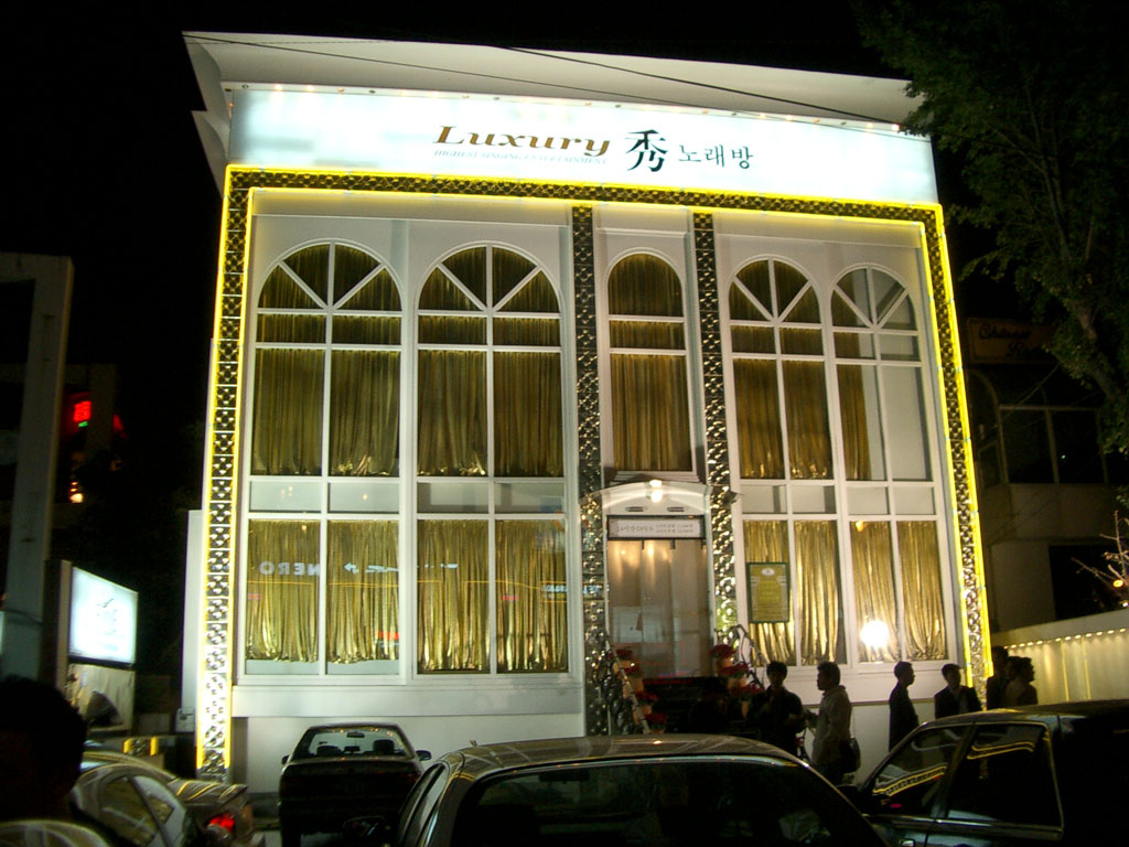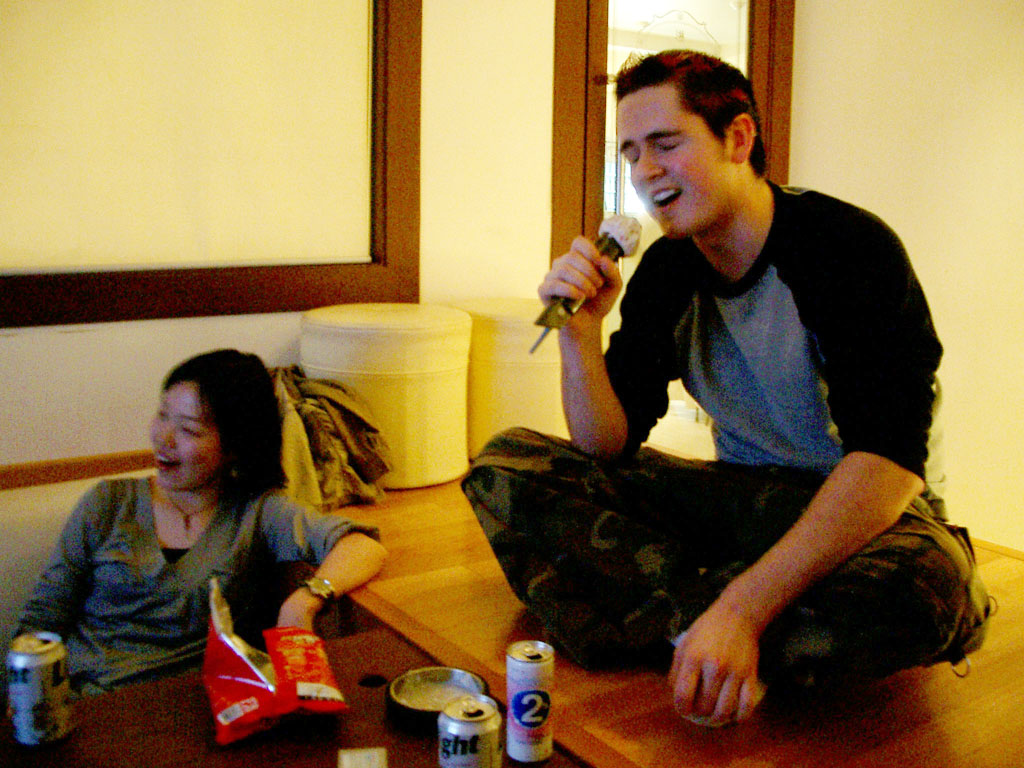 | Last year when I travelled to Korea with Jane I met this fellow Jay Kim, a former high school teacher turned game developer, making massively multiplayer online games that teach a middle-school curriculum. He was eager to travel around town together, and generous with my friends. He took all of us to a Noribang, a singing room, what we might call karaoke. Except in Korea, as I'm told, Karaoke is what you do when there's fifty people watching one singer up at the front; noribang is when you have a private room to sing in. We didn't have just any private room, we had a private room at a "Luxury" noribang. Tasteful, clean furnishings, multiple wireless mics, a large flat-screen TV at the front, attendant service on call. |