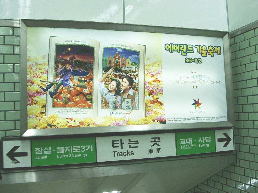 The Techno Mart is a ten or twelve storey shopping mall packed with tiny shops selling a wide range of hard-core geek and accessible consumer electronics. I was there on three separate occasions, hunting a laptop bag, a Korea-friendly power adapter for my GameBoy and some video games. This advertisement for the Techno Mart, in the subway station beneath it, depicts a US-style squared-off plug as a man and a Korean-style round-peg plug as a female, in traditional Korean costume. They are working out the relationship of international electricity standards in the dance of gender and tradition. I can only assume the idea behind the characters is, we can handle all your power prongs. The poster is advertising the whole mall; regretfully I only captured this couple and not the whole poster so I can't ask Hongol-reading friends for confirmation of the electric appliance miscegenation here. |