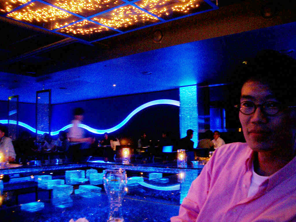| Howard introduced me to Jean Kim, a business school graduate student in Seoul. He has a searching intellect, curious about the ways technology is shaping politics and community in his country. He sent me his research on Oh My News, the amateur net-powered Korean news powerhouse; you can find his columns online in Korean. We went out to a microbrewery, Platinum. There were three floors; Ocean, Earth and Sky. This is the Ocean floor - rich blue lights abounding, a smattering of stars on the ceiling. In the center of the large table we shared with two dozen other chairs was some confabulation of translucent plastic, light and smoke machines. Whimsical fun with electric light and interior design - inspiring. | ![]() |