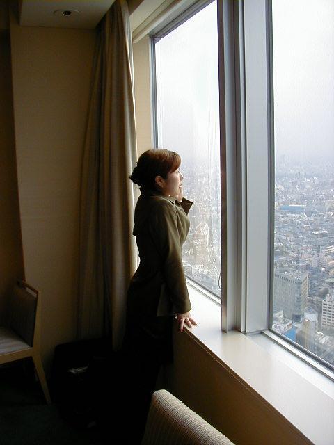 Sanae window I saw a young lady, professionally dressed in a dark green skirt-suit, a pale yellow leather jacket. Her slightly bleached hair was up in a bun, and her eyes had some faint blue eyeshadow. She was cute and she was curious; I noticed her eyes drifting closer to me more often than other ladies.